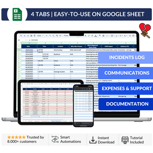 Custody Logs includes a set of structured sheets designed to help you document everything that matters — while it’s happening.